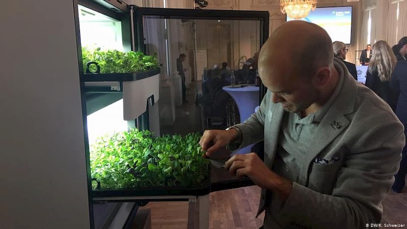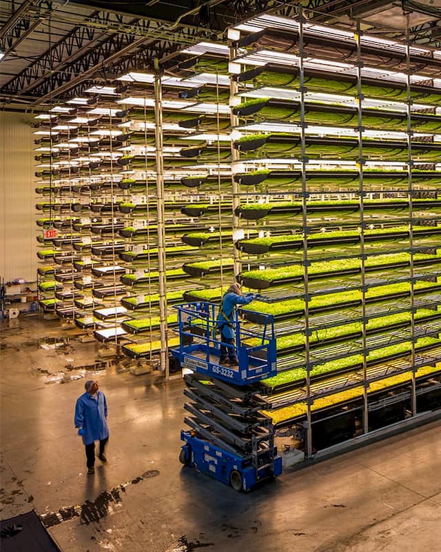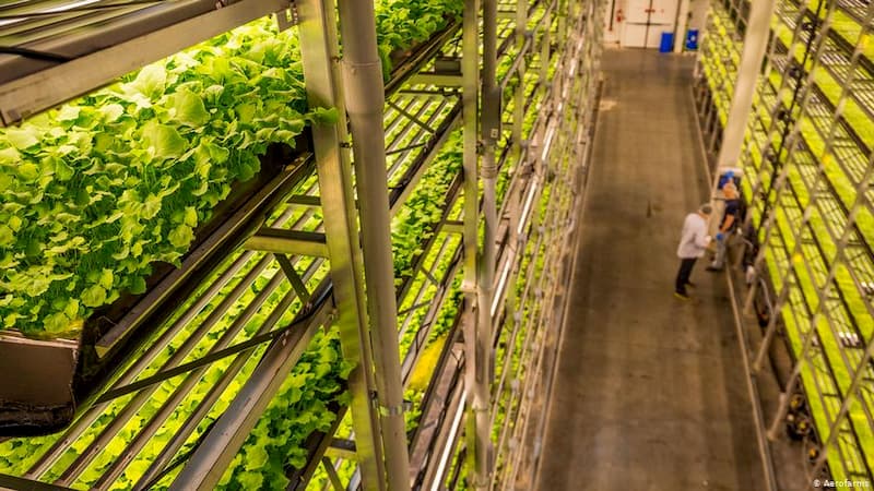 垂直农业就是在室内种植蔬菜,多个种植层垂直叠在一起,通过 LED 提供光照,并用水雾或滴灌系统浇水,可实现全年高产。田野种出蔬菜需要30到40天,垂直农业只要10到12天。更重要的是,与传统农业相比,垂直农业的用水量减少了多达95%,这对沙漠国家意义重大。不过,由于空调和 LED 需要恒定的电力供应,因此会消耗大量能源。