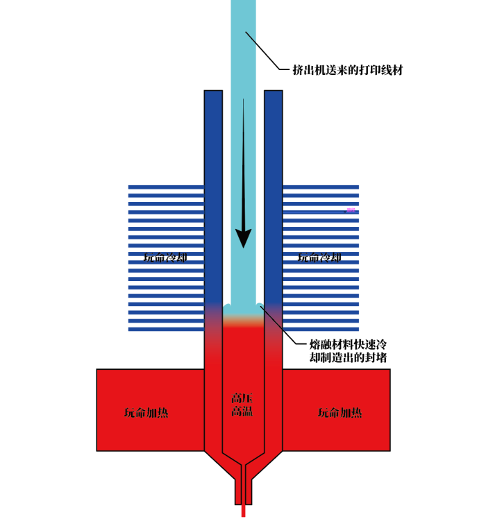 原因如上图:打印线材的直径是略小于喉管的,我们需要一个在短距离内剧烈变化的温度差,来让一些材料封住喷嘴附近的高温区域,以此保证喷嘴里面的熔融材料的压力只有喷嘴一个”泄压口“。如果上半部分的散热不及时,熔融的材料就会从线材与喉管内壁之间的空隙向上”反向挤出“,然后在上面凝固,裹住耗材,极大地增加线材挤出的压力——表现为类似堵头的症状。请记得这一关键原理,遇到无法解释的堵头类似症状时或许有用。