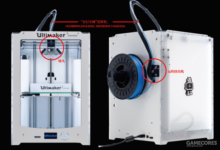远程挤出机(上图),则是在挤出机和喷头之间连一根特氟龙管,打印线材走内部(自行车闸线原理),如此喷头得以轻量化,惯性小,可以高速打印,但由于材料的弹性和特氟龙管内壁的容差,挤出机动作反映到喷头会有延迟,也就是会有点挤出动作和喷头的移动“音画不同步”的问题。(这一问题比较先进的主板会提供一个叫做“挤出机线性系数”的设置来尽可能矫正,也就是挤出机的一切动作都提前零点几秒做出。但是依然,单就这一点上,远程还是比不上近程挤出机。)