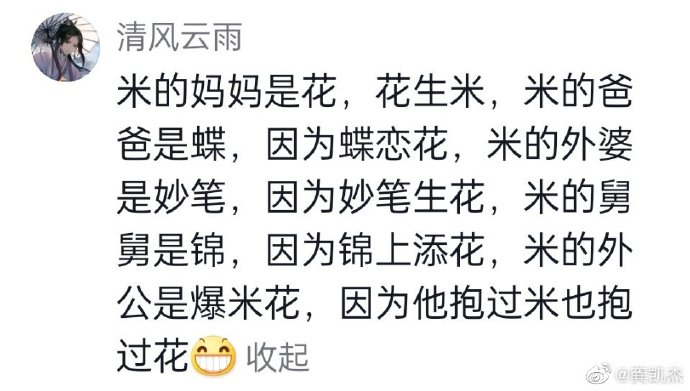 米的妈妈是花,花生米!(米的爸爸是谁,外婆外公是谁,舅舅是谁!赶紧了解一下,哈哈哈!)
