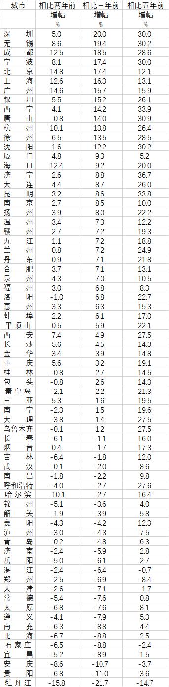 相比五年前,大多数城市还是上涨的。