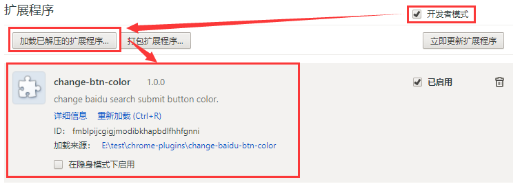 然后打开Chrome的扩展程序管理页面,勾选“开发者模式”,将这个插件加载到Chrome浏览器使其生效,如果没有错误的话,应该是这个样子的: