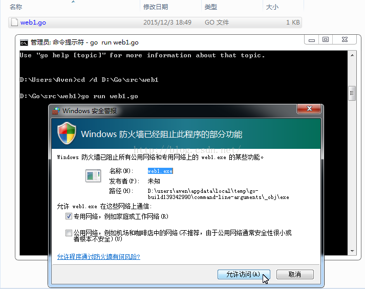 所以我在D:\Go\src\目录下创建了一个“web1”文件夹,新建了一个“web1.go”文件,将上面的代码复制粘贴到文件中,保存。