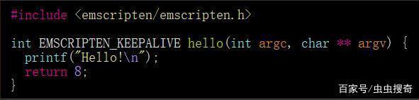 为了实现从JavaScript调用WebAssembly函数,让我们调整先前定义的Hello World,给他引入emscripten:头: