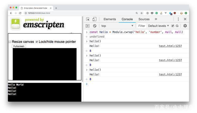 现在我们启动Web服务器,一旦页面打开,在控制台中调用Module.ccall Module.ccall('hello', 'number', null, null),结果会打印 "Hello World!"并返回8: