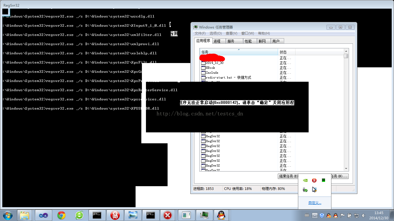 开始→运行→输入“cmd”回车,然后输入“for %1 in (%windir%\system32\*.dll) do regsvr32 /s %1”这条命令即可(双引号不用输入)。