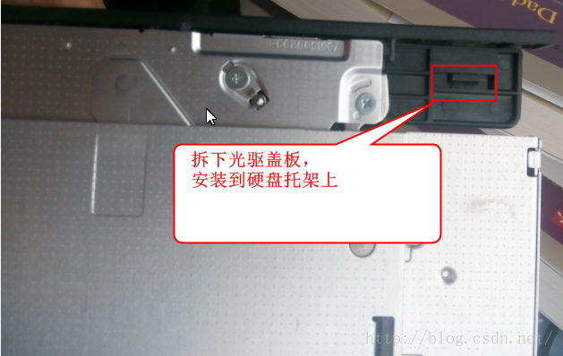 7、拆除光驱盖板,安装到光驱位硬盘托架上