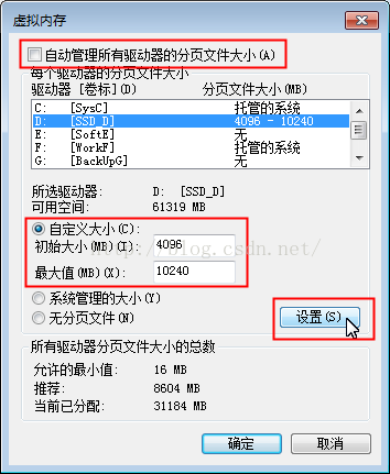 如果你只有一种类型的硬盘,其实选择“自动管理所有驱动器的分页文件大小”就可以了;