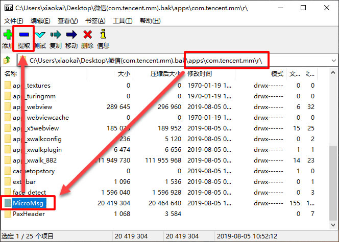 7,进入“apps/com.tencent.mm/r”目录,将该目录下的MicroMsg文件夹提取出来。