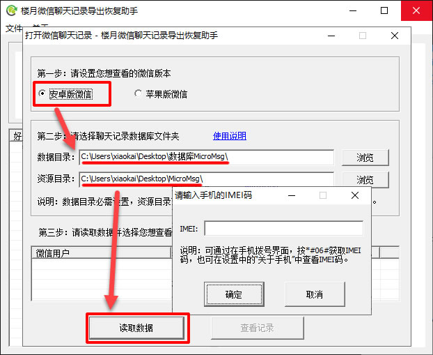 11,最后打开楼月微信聊天记录导出恢复助手(点击此处下载),微信版本设置为“安卓版微信”,数据目录设置为从7-zip软件中提取出来的“数据库MicroMsg”,资源目录设置为解压得到的另外一个MicroMsg文件夹,最后点击“读取数据”按钮,如果软件无法从数据库目录中获取到手机的IMEI码的话,会要求输入该手机的IMEI码。