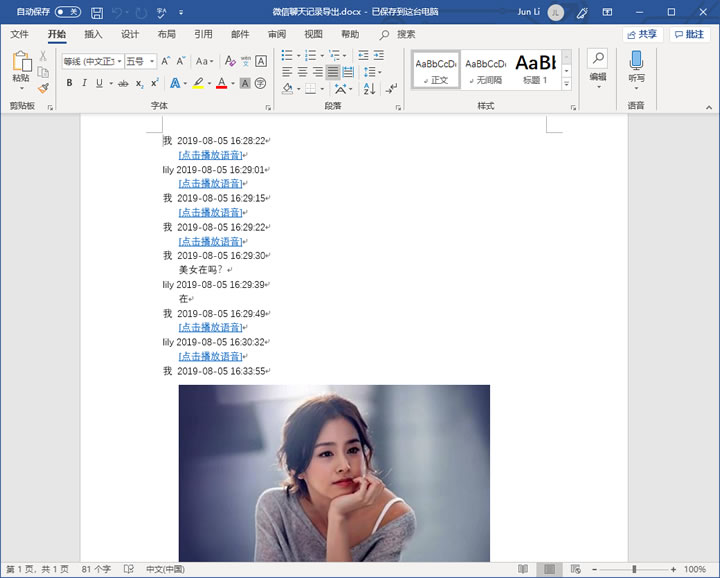 15,然后将复制的微信聊天记录粘贴到电脑上的Word文档中就可以了。