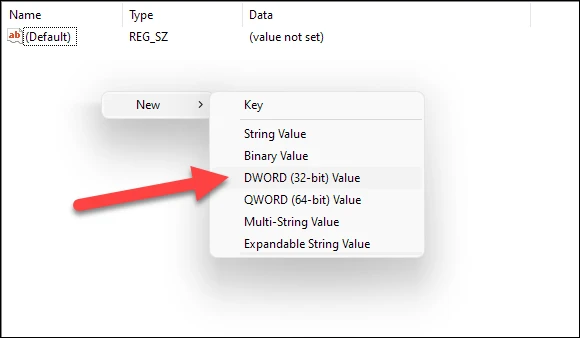 现在,在“ LabConfig”键下,通过右键单击空白空间选择“ New”,然后是“ DWORD (32位) Value”选项,创建一个新的 DWORD 值。