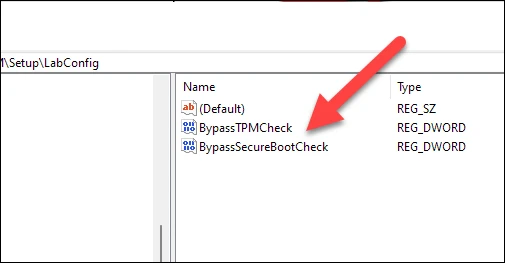 给这个值命名为 BypassTPMCheck,然后类似地创建另一个名为 bypassecurebootcheck 的 DWORD 值。