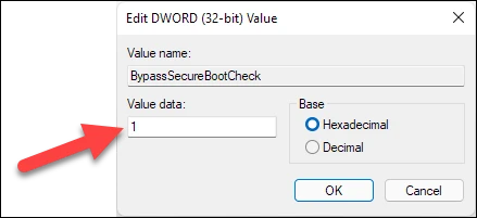 类似地,编辑 BypassSecureBootCheck 值和 Value data 字段中的 input 1,然后点击 OK 按钮。