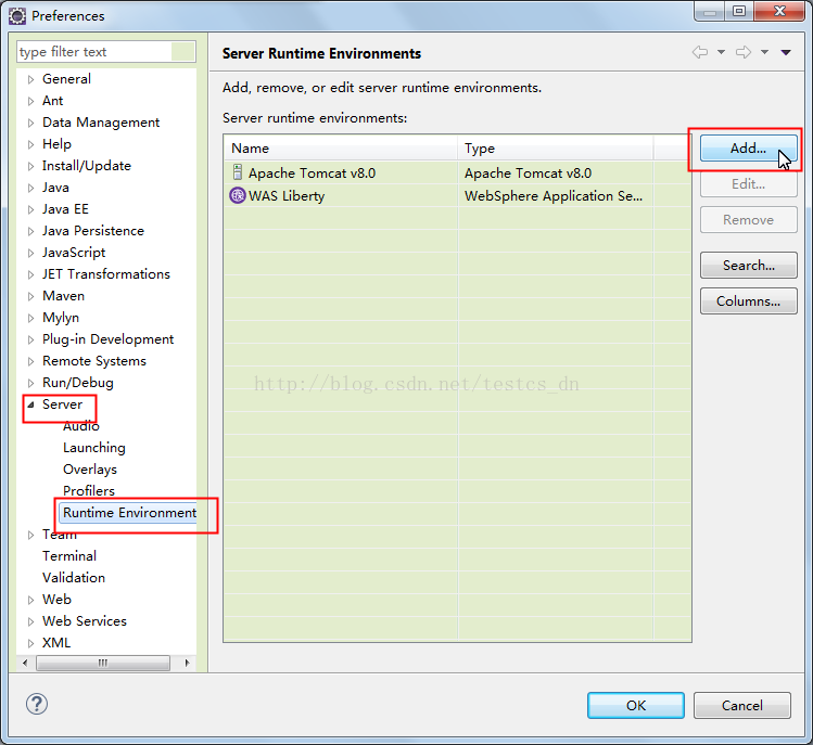 2、在左侧列表中找到 Server 项,展开,选中:Runtime Environments,右侧点击添加按钮