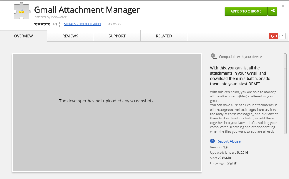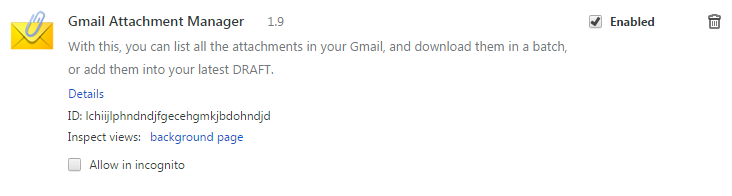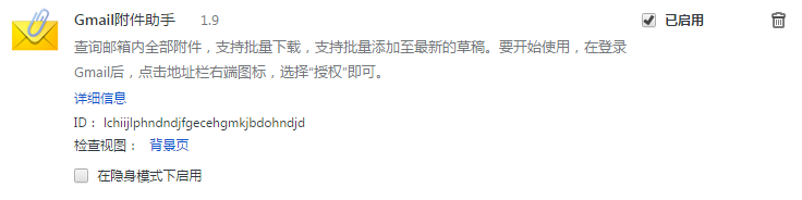 "description": "查询邮箱内全部附件,支持批量下载,支持批量添加至最新的草稿。要开始使用,在登录Gmail后,点击地址栏右端图标,选择“授权”即可。",