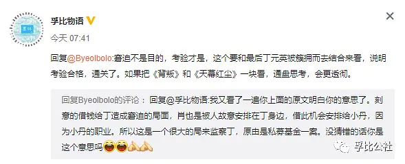五、回过头,我们再来看丁元英结束私募基金这件事,背后的水应该很深。大概率是上层斗争的外显。韩总夫人借钱?很大的一个疑问,韩楚风是大型国企的老总,这个背景是石锤的不简单呀。肖亚文的背景应该也不简单。如果丁元英是棋子的身份,那么他贴身的人员都不简单,不要忘了肖亚文是从公安大学毕业的这个伏笔。如此,女主也大概率是特意安排给到男主的。肖亚文给女主的不要爱上男主的忠告,真的是忠告。下面有段和网友的互动: