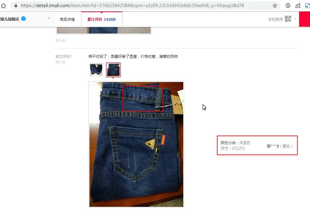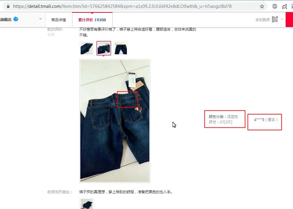 下面中间的小图是商品描述图片,大图有标注的是收到的实际商品的图片,色差因为光线的原因拍出来的可能会差别特别大,但商家有责任拍出最接近现实的颜色;其它像裢腰上的标,做旧的工艺,品牌就很容易看出差别了;然而就这样,得到的结果是举报不成立。而且举报处理之后没有任何消息通知。