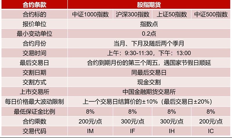 中证1000股指期货在合约设计上与现有的三个股指期货品种几乎相同,中证1000股指期货的合约乘数为200元/点,与中证500股指期货一致。中证1000股指期权与已上市的沪深300股指期权合约基本一致。