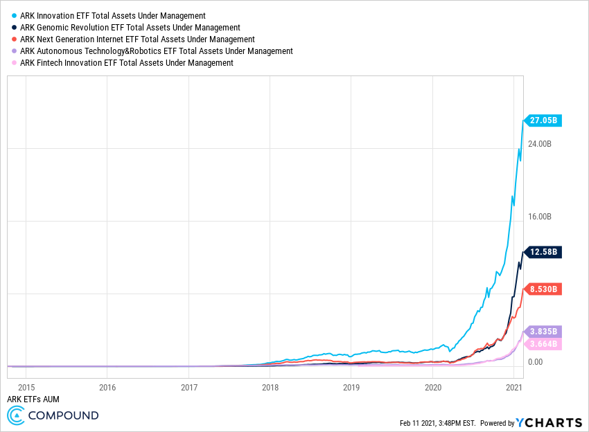 这种趋势在 2021 年初继续存在,1 月份出现了模因股票热潮,2 月份又达到了顶峰。我当时写了这篇文章,因为受 FOMO 驱动的投资者正在追逐业绩并向我们这个时代领先的选股公司 (ARK Invest) 投入数十亿美元。