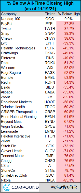 许多去年高增长/科技/IPO/SPAC 的最爱现在都显示出大幅缩水……