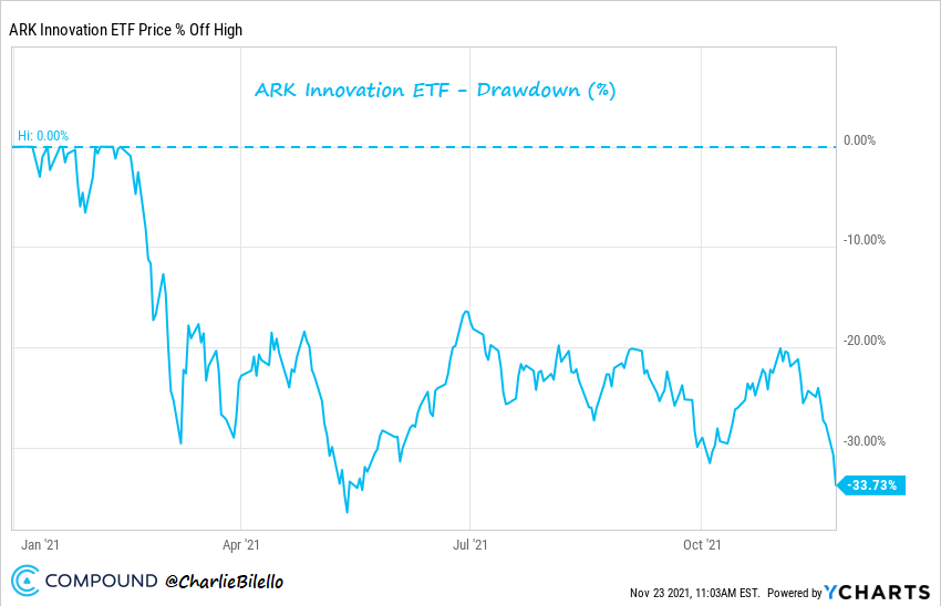 旗舰选股基金 ($ARKK) 比 2 月份的高点低 33% 以上。