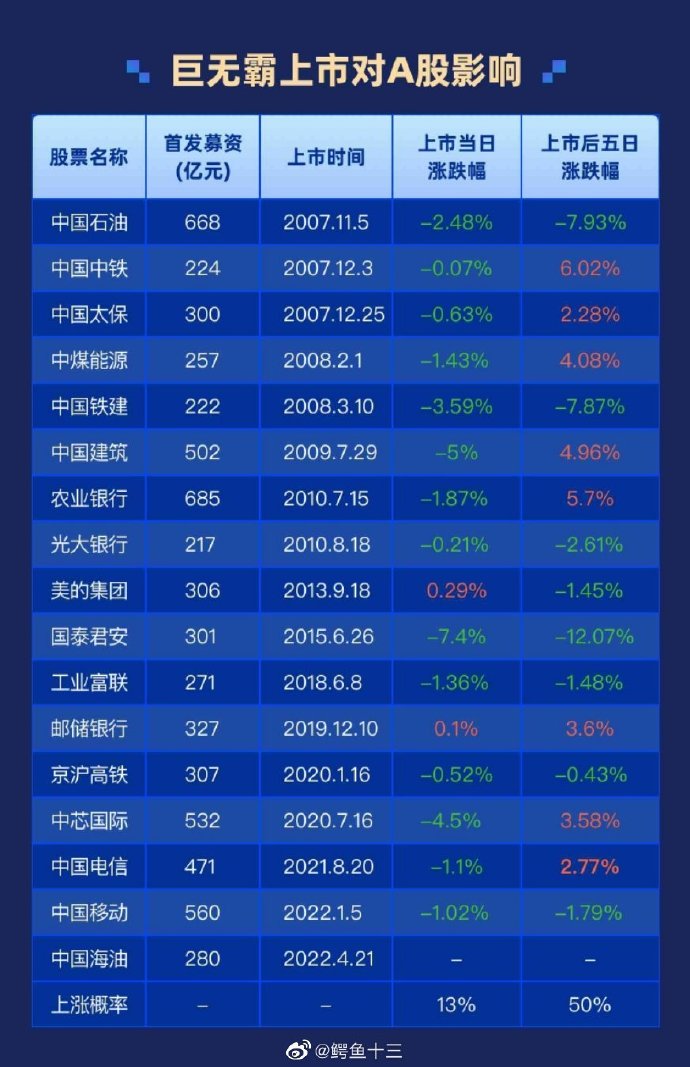巨无霸上市: A股股市涨跌规律先说结论,巨无霸上市,A股历史上涨概率只有13%。叠加喜欢下跌的419行情,今日新闻标题: 两市仅4300家下跌。今天中海游上市,三大股指再次无抵抗下跌。 #