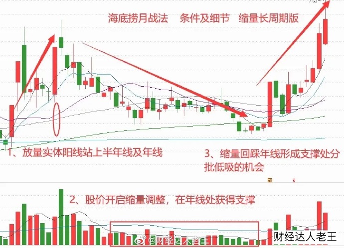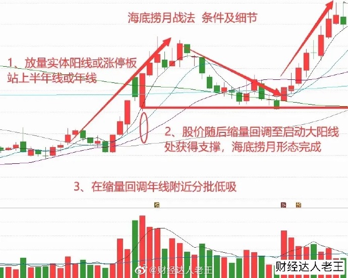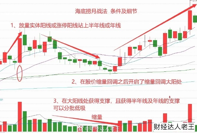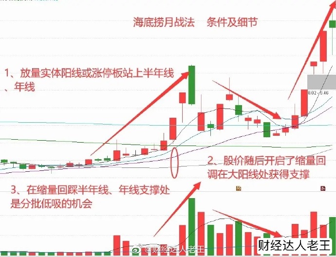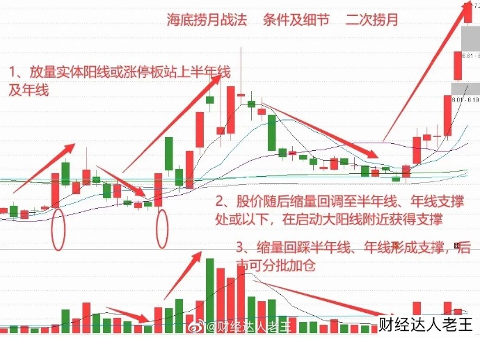 一、什么是“海底捞月”战法:股价经过一波带量拉升,以中阳线或涨停板有效突破半年线或年线长期均线,随后股价快速地缩量回调至半年线或年线之下,在中阳线或涨停板的启动点获得支持,接下来股价有望走出一波带量拉升的行情是短线极好获利机会。