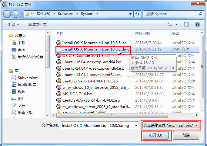 你可能会发现看不到dmg格式文件的问题,注意打开按钮上面的文件扩展名下拉列表,点击它,选择所有文件(*.*)就可以了。