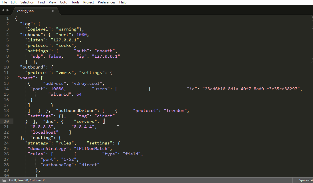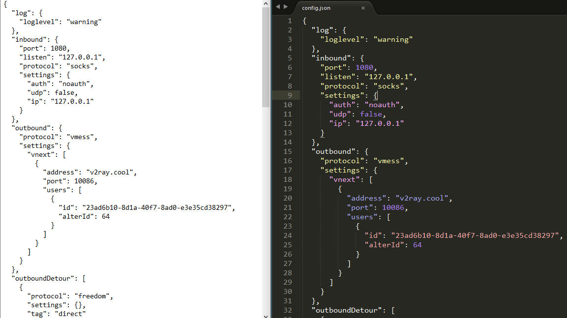 不过,最好还是使用 V2Ray 提供的配置检查功能(test 选项),因为可以检查 JOSN 语法错误外的问题,比如说突然间手抖把 vmess 写成了 vmss,一下子就检查出来了。