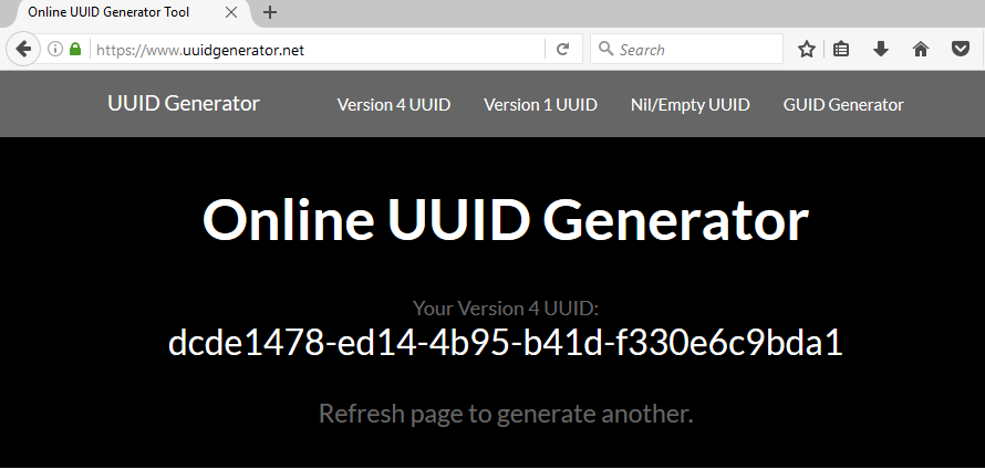 由于 id 使用的是 UUID,我们可以使用任何 UUID 生成工具生成 UUID 作为这里的 id。比如 UUID Generator 这个网站,只要一打开或者刷新这个网页就可以得到一个 UUID,如下图。或者可以在 Linux 使用命令 cat /proc/sys/kernel/random/uuid 生成。