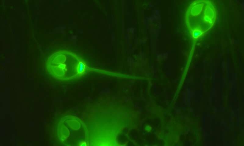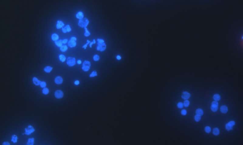这种多细胞生物没有线粒体,因此不需要氧气。它是鲑鱼的一种寄生虫,类似于沙门氏菌。科学家猜测,它可能使用某种蛋白质从宿主体内窃取能量。下图是它的 DNA(蓝色圆圈),看不到线粒体。