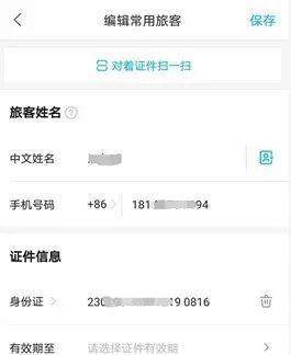 前面也提到,犯罪分子精心设计的这么一套犯罪脚本,在身份信息获取这种比较容易的环节上,一定是会有备用方案的,目前据我所知的在获得短信权限的情况下比较容易获取的如各类连锁酒店APP(如华住、锦江)、商旅订票类(如去哪儿),这些包含身份证信息的APP和网站,对于身份证号码信息的泄露风险并不是说不知道,只是在业务的“用户体验”面前,安全已经不算个问题了,毕竟我这种案件的数量还是不多。以去哪儿为例,在常用旅客列表中,对身份证信息进行了屏蔽显示,但点击进入信息编辑界面时就明文展示了: