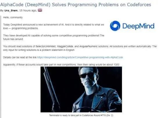 近期,世界著名的编程竞赛网站Codeforces发布了一篇名为《AlphaCode ( DeepMind) Solves Programming Problems on CodeForce》的文章,将 AlphaCode带入人们的视野,更让DeepMind