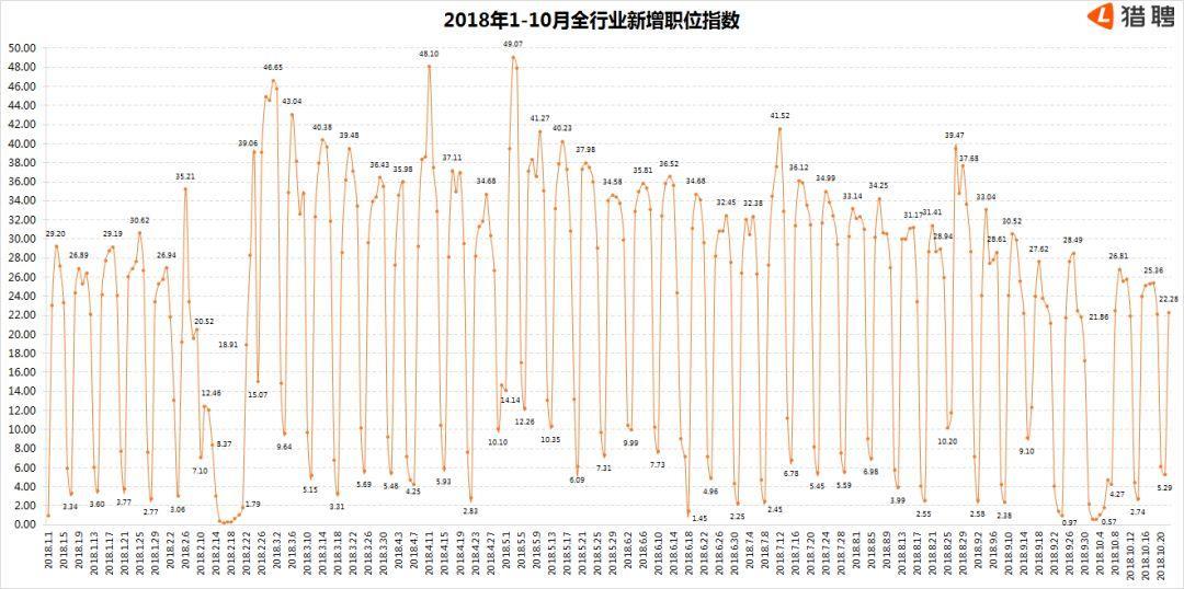 根据猎聘大数据“2018年1-10月全行业新增职位指数”显示,从2018年9月中旬以来,全行业新增职位指数的确呈现较明显的下降趋势。